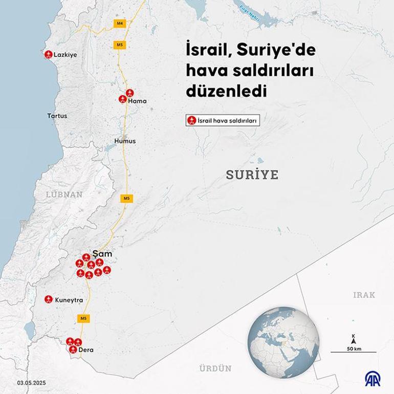 Şam’ın Haresta ile Tel Mınin bölgelerini hedef alan İsrail uçakları, Hama, Lazkiye, Dera ve Kuneytra’daki hedeflere saldırdı. Bu kentlere düzenlenen en az 12 saldırıda can kaybına ilişkin, resmi makamlardan henüz bilgi paylaşılmadı. İsrail uçakları dün de Şam’da Cumhurbaşkanlığı Sarayı yakınlarına saldırı düzenlemişti.